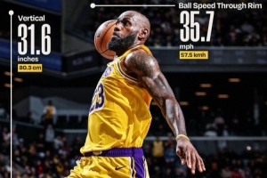 老詹今日对阵篮网暴扣垂直起跳80.3厘米&滑行2.9米 球过筐时速57.5公里(16米每秒)