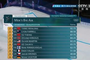 体育资讯02月06日讯 冬奥会单板滑雪男子大跳台资格赛第二轮结束,苏翊鸣、杨文龙第二跳均拿出精彩表现,葛春宇两轮过后已经无缘晋级。