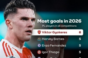 英超球员2026年各项赛事进球榜:约克雷斯6球独占榜首,恩佐等5球
