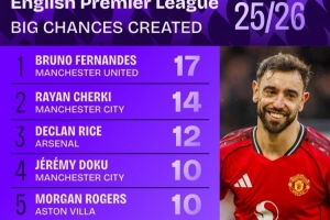 本赛季英超创造重大机会榜:B费、谢尔基、赖斯前三,内托在列